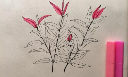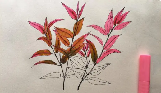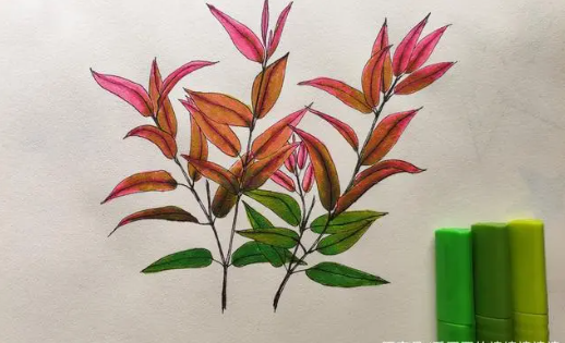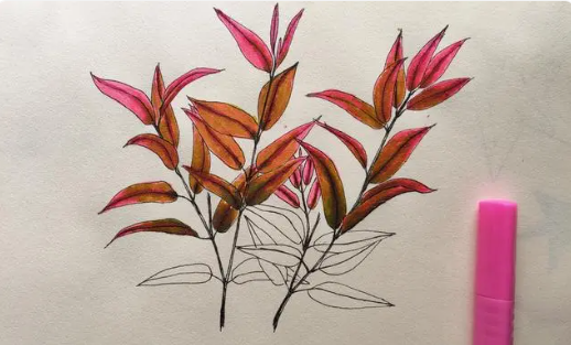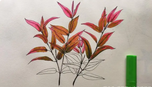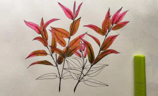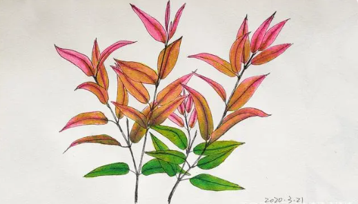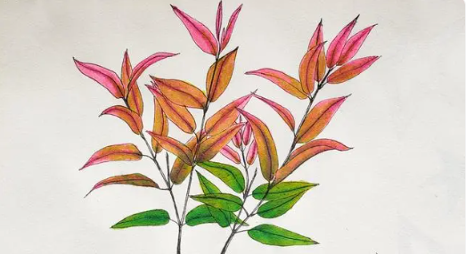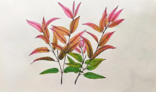 (1)先涂末梢的嫩叶(如下:先涂粉嫩的整片叶子,再画出主脉络,梢头最嫩的叶子就画好啦)