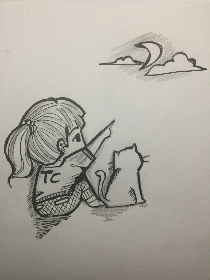 小女孩和她的猫一起看月亮的铅笔卡通简笔画