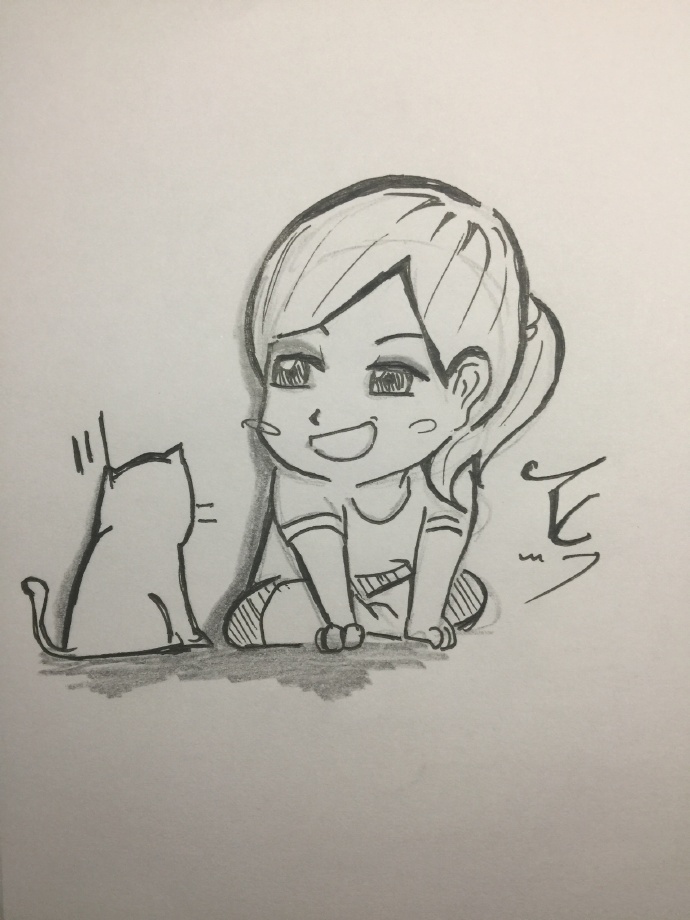 小女孩和她的猫猫一起运动跑步的卡通铅笔人物简笔画
