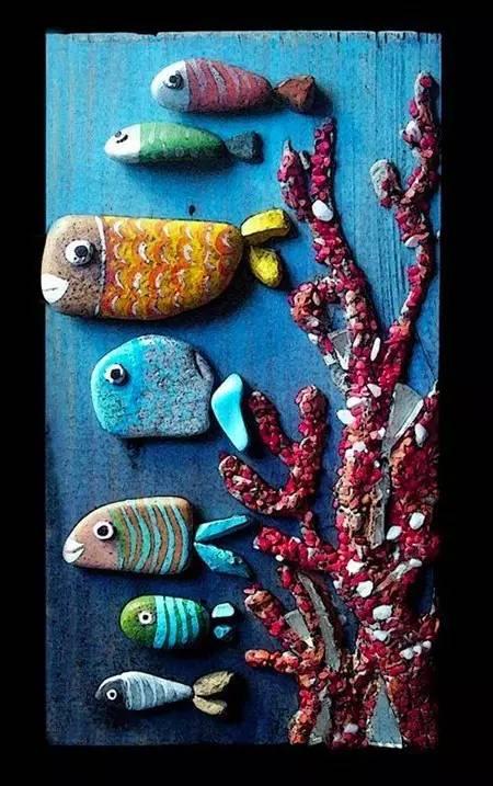 石头彩绘拼画,自在的鱼儿石头拼画,小鱼儿石头彩绘