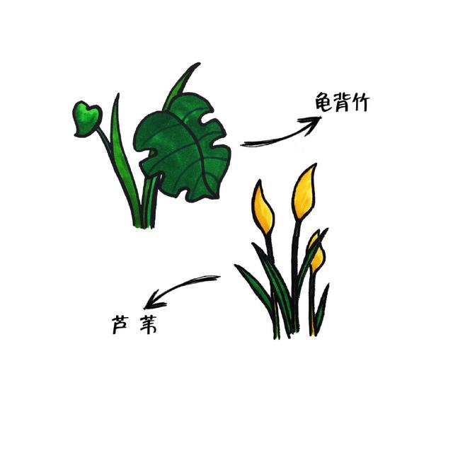 龟背竹和芦苇植物彩色涂色简笔画