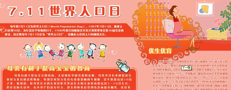 今天是世界人口日,请将“控制人口数量,提高人口质量”这句话默念两遍,并在适当的时候予以施行。要知道“优生优育,人人有责”。祝你人口日快乐!