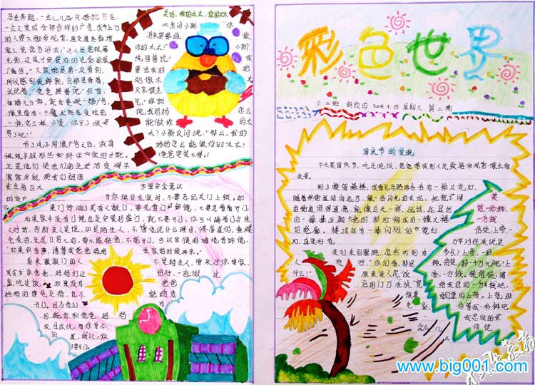 3、《彩色世界》国庆节手抄报 内容:国庆节的夜晚、加强安全意识等