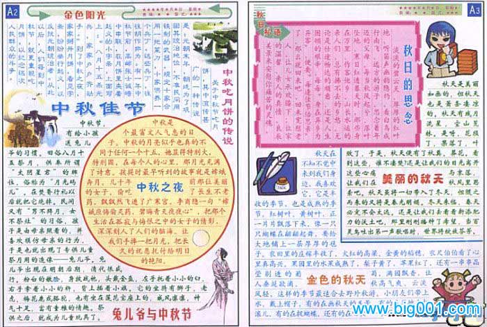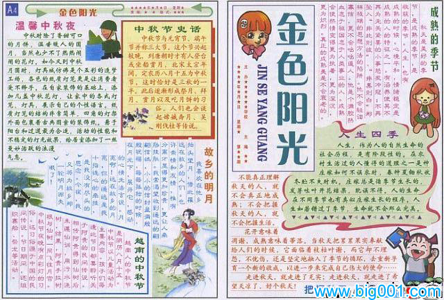 2、《金色阳光》中秋节电子小报 内容:中秋节鬼话、温馨中秋夜、成熟的季节等。