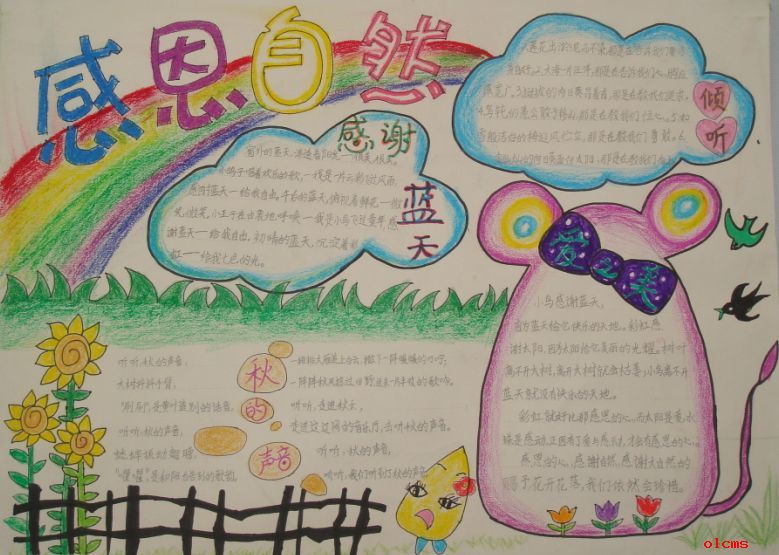 感恩自然,你或许可以为自然插上绿荫,多一份新绿,少一分荒芜;或许可以回收垃圾,不要让污移的垃圾侵蚀我们美好的家园……学会感恩自然,珍惜大自然的产物,其实就是感悟生命的真谛。