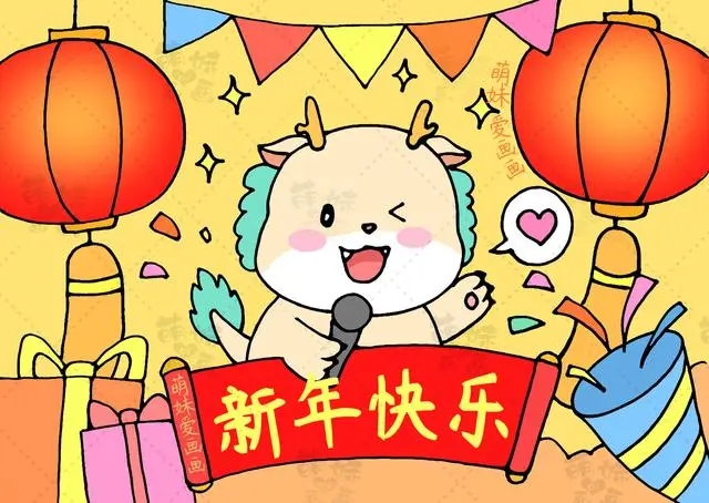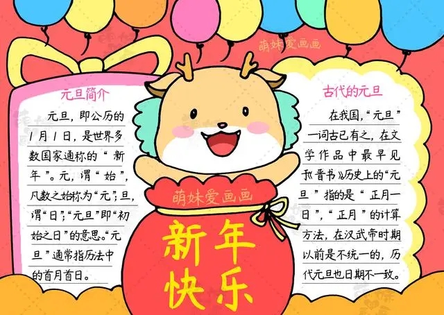 我们用灯笼、礼物盒和气球来装饰,用气球作为手抄报的报头,最后我们可以在手抄报的左下角绘制一个卡通小龙形象,大家喜欢这款手抄报吗?