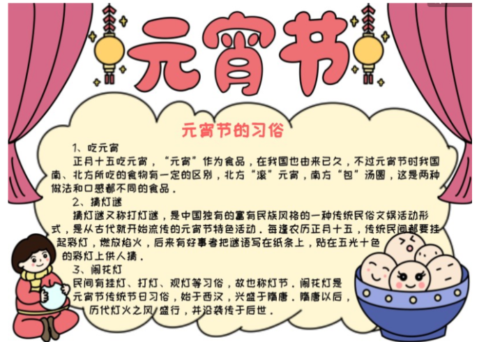 手抄报画好之后有很多内容可以写,比如元宵节的由来,元宵节的灯谜,元宵节习俗等,如果不知道怎么写可以参考以下文字素材。