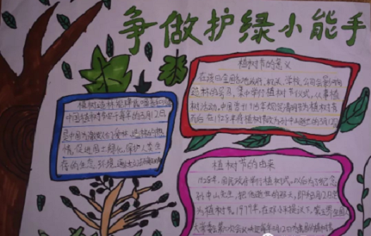 第一板报网 3月12日植树节,在这万物复苏、大地回春的日子里,我们又迎来了一年一度的植树节。为了进一步提高全校师生的绿化意识和文明素质,用自己的双手努力营造一个良好的环境,学校小学生以“植树节”为契机,组织开展“行动起来争做护绿小使者”为主题的护绿活动。通过开展形式多样的护绿行动,做到人人参与,宣传与实际行动相结合,从而令队员们在活动中体验成功的喜悦。