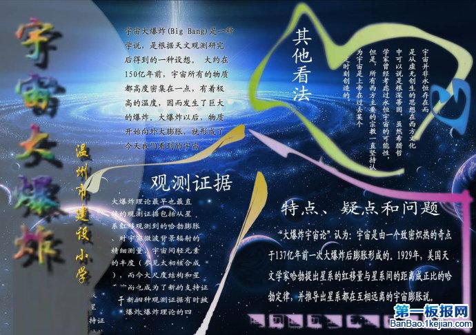 宇宙大爆炸(big bang)是一种学说,是根据天门观测研究后得到的一种设想。大约在150亿年前,宇宙所有的物质都高度密集在疑点,有着极高的温度,因而发生了巨大的爆炸。观测证据 特点、疑点和问题 其他看法