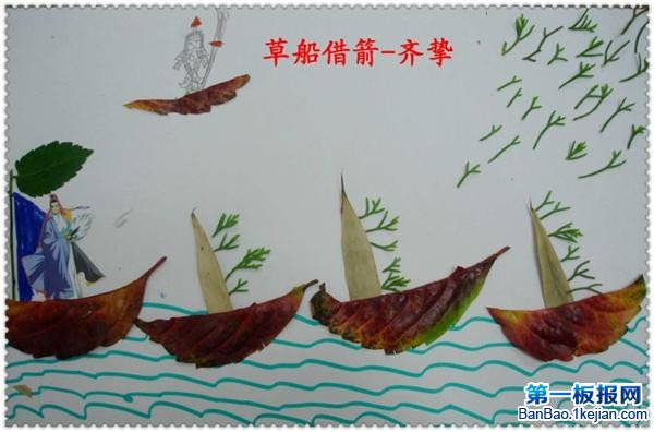 小编导语:秋天的树叶飘落了,让我突发奇想,于是拿起树叶,粘贴出一幅画——草船借箭。秋天的事业不但美丽还给人无限的灵感。