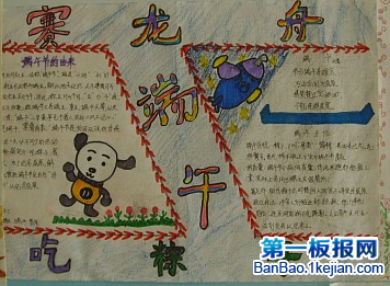 端午节即将来临,先祝大家端午节节日快乐,这个节日的习俗特别的多,有好看的赛龙舟,还要吃鸡蛋、粽子,粽子是我的最爱哦,还要在门前插树枝叶等等好多的习俗哦,这个节日我喜欢,下面是我自己制作的手抄报,请大家欣赏。