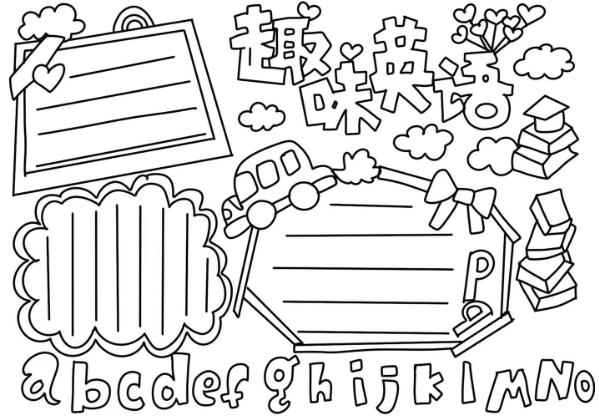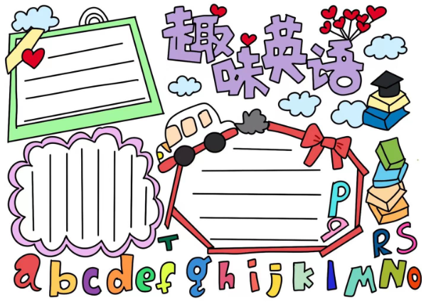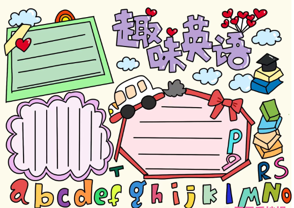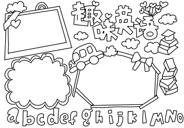 1、首先写上“趣味英语”的文字,在文字上画几个小爱心,周围画上小云朵,下面画个小汽车和蝴蝶结,接着画出三个空白文字框,再画面的下方画出英文字母。